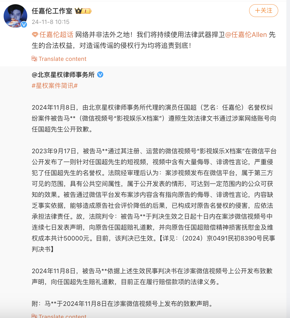 对于先前所面对的相关负面困扰,任嘉伦的工作室早前也针对相关造谣事件提告相关人士,该工作室表明网络并非法外之地,势必维护任嘉伦的合法权益,对一切造谣传谣及侵权等行为绝不姑息及追责到底。
