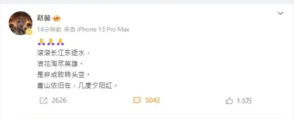 内文先是附上了3个双手合十的符号,隐晦地写下诗词“滚滚长江东逝水,浪花淘尽英雄。是非成败转头空。青山依旧在,几度夕阳红。”网民纷纷发声:“就知道小燕子会出现的”。
