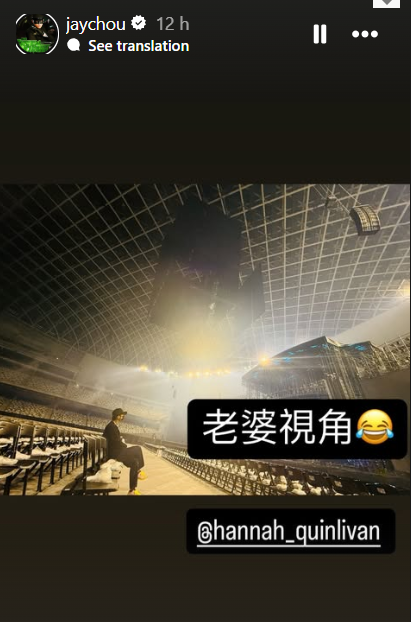 周杰伦除了在台上彩排,也坐在大巨蛋观众席体验,他在限动就PO出一张“老婆视角”,而昆凌也转发表示:“认真的你,忍不住偷拍一下。”