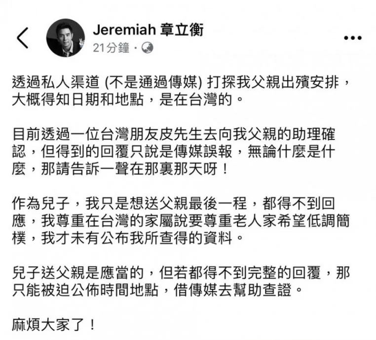接着,章立衡再透过脸书喊话:“我已得知对方回应。既然这么重要的事可以用如此肤浅跟幼稚理由来回避,我只能表示明白与尊重。那就只能在这里对父亲说,一路好走。儿子 刘子千 叩挽”。