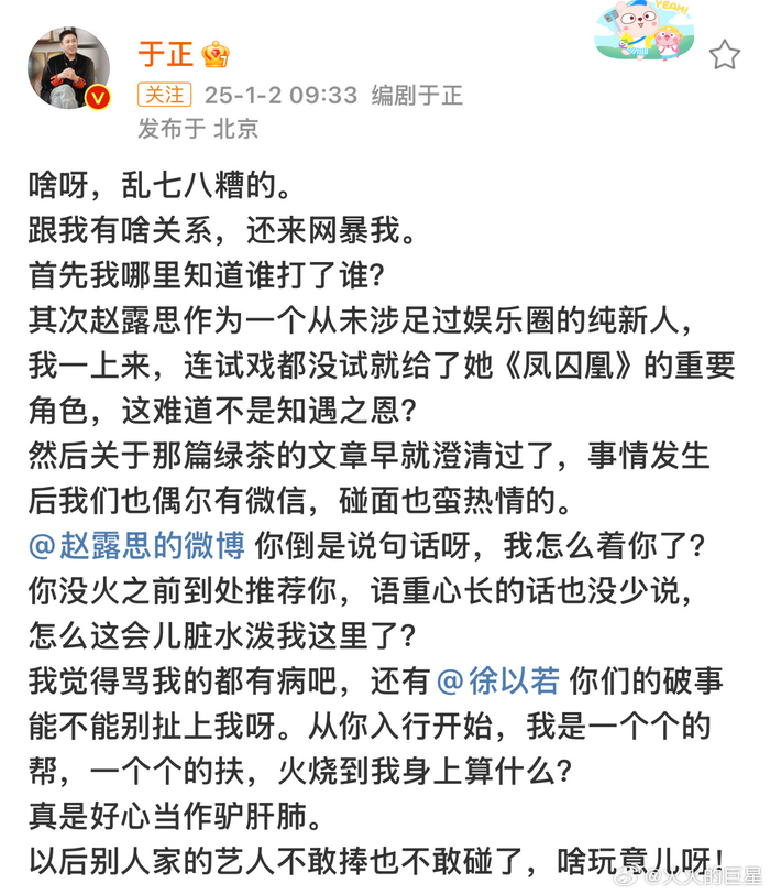 作为徐以若好闺蜜的于正,早前还发文说过【赵露思不懂感恩,用完就丢】之类的话,因此被骂的于正也火速发文,还@赵露思及徐以若喊冤,澄清这事儿和他没有任何关系,表示再也不捧别人家的艺人!