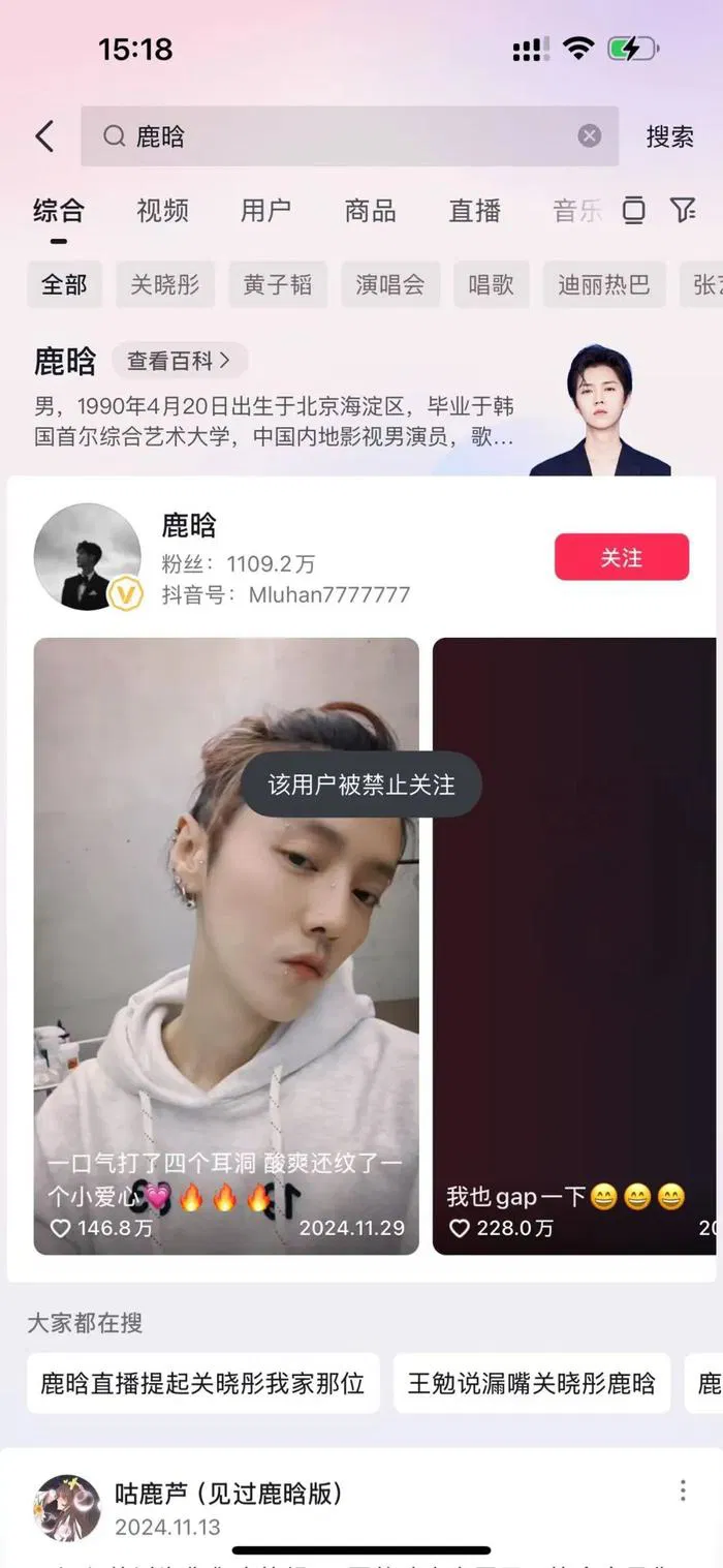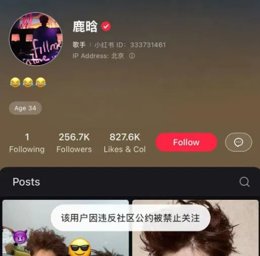 鹿晗在行为失序后,他的3大社群平台“微博、抖音、小红书”今日全皆遭官方下令“禁止关注”,平台显示理由为“该用户违反法律法规”,话题马上冲上热搜第一。