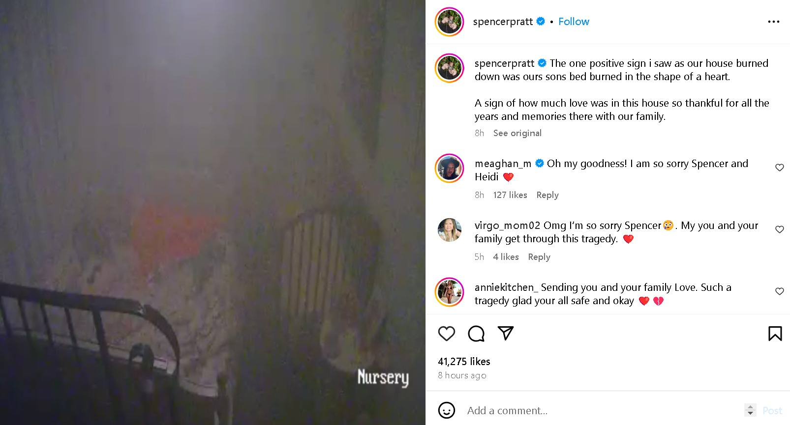 真人秀明星斯宾塞普拉特(Spencer Pratt)和海蒂蒙塔格(Heidi Montag)也遭遇类似命运,他们透露家园被毁,斯宾塞在感慨中提到,尽管家被烧毁,但儿子的床被烧成了心形,象征着这座房子曾充满爱。