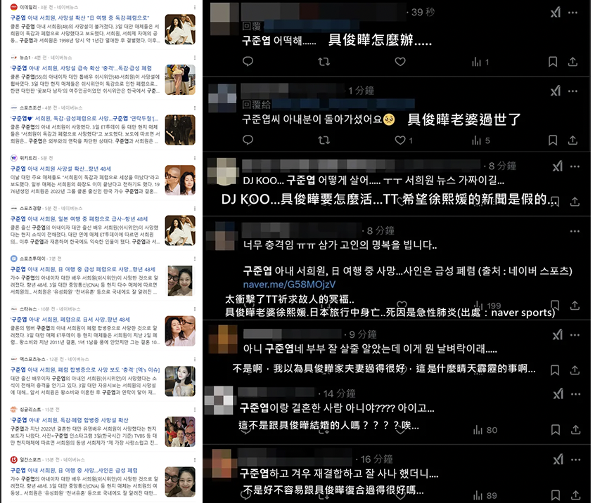 大S病逝的消息一出后,韩国粉丝与网友也在社群平台X上发文哀悼,对于大S的死讯深感震惊,“天啊,这竟然是真的!台湾艺人徐熙媛因急性肺炎离世,一路好走”、“也太突然了”
