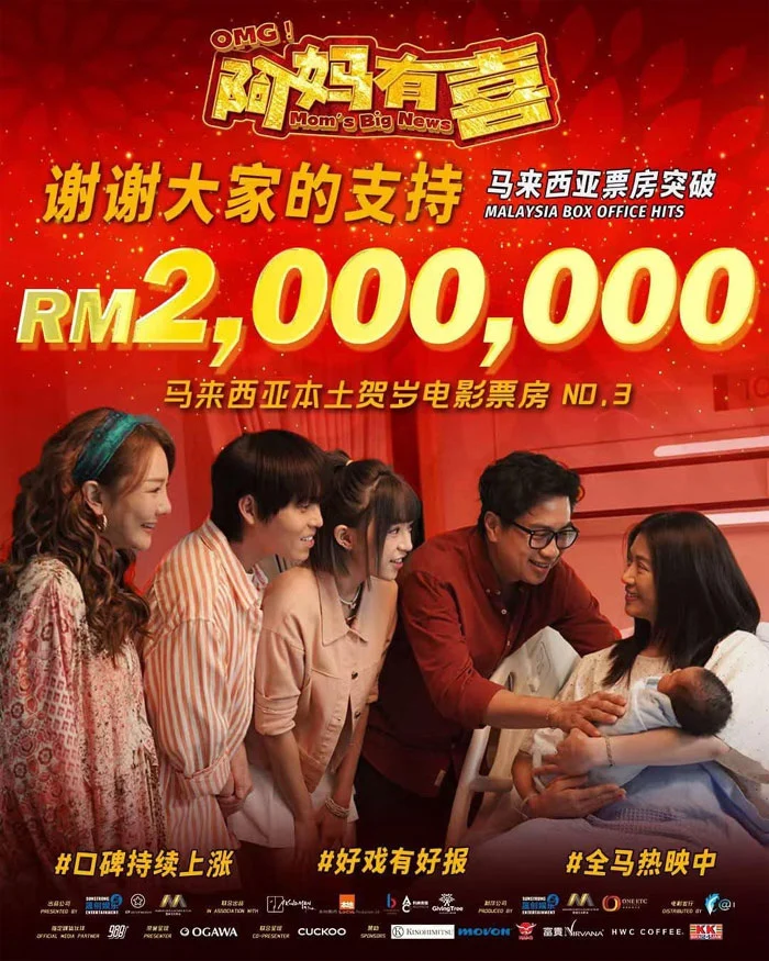 由金像奖影后袁咏仪与本地著名的988电台DJ陈峰领衔主演的OMG!《阿妈有喜》,在大年除夕上映后,好评不断口碑皆佳,更凭持久和逐渐升温口碑,晋升为大马本土贺岁电影第3名的成绩。截至2月8日为止,OMG!《阿妈有喜》票房已突破200万令吉。