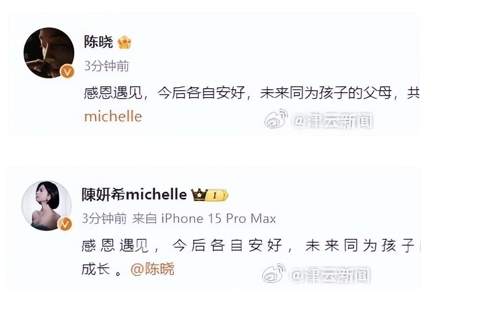 两人在微博共同发布离婚消息,写下共同贴文及互相标注对方账号:“感恩遇见,今后各自安好,未来同为孩子的父母,共同陪伴孩子成长。”