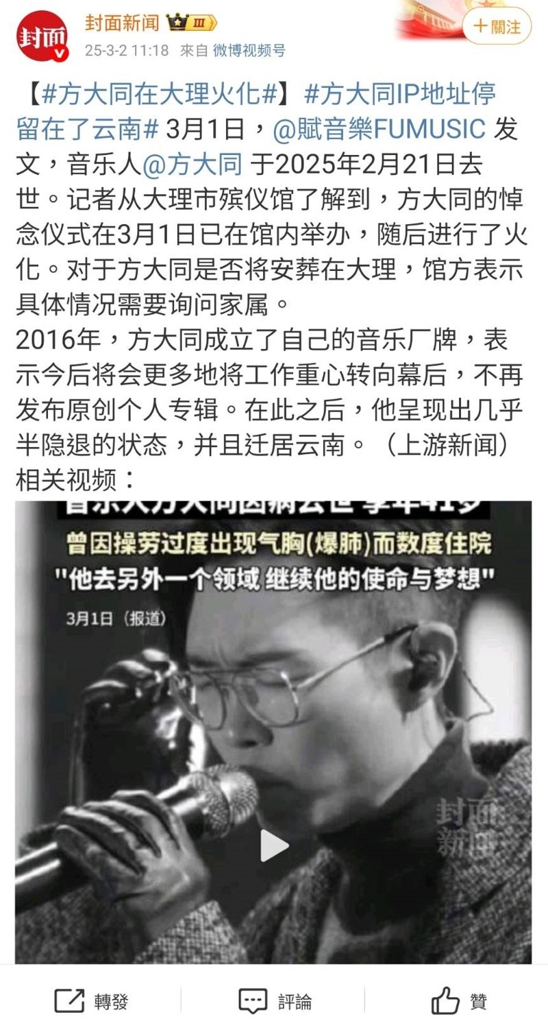 较早前,中国媒体《封面新闻》报道,方大同2月13日在微博最后一次发文,IP位址是在云南,媒体从云南大理市殡仪馆了解到,方大同告别式后就在当地火化,至于骨灰最后放哪,殡仪馆方面表示具体情况要询问家属。