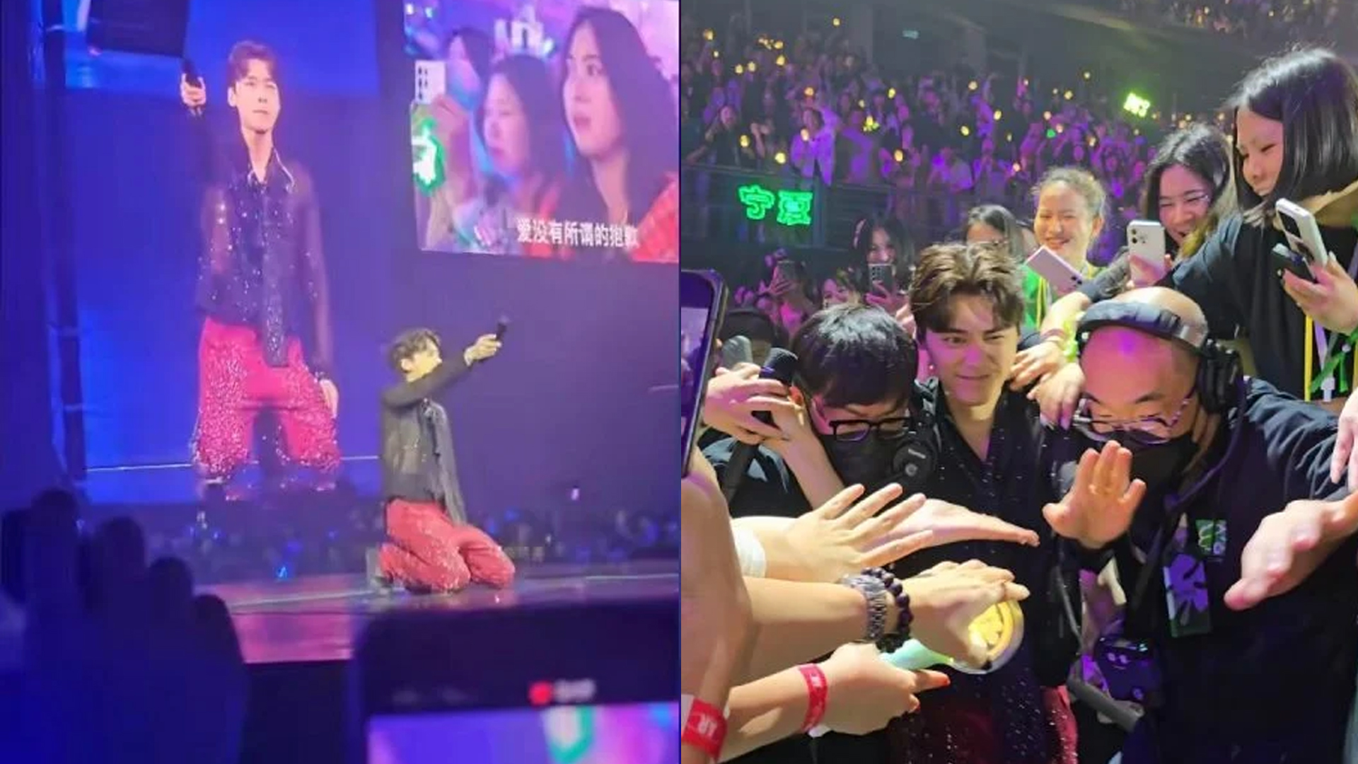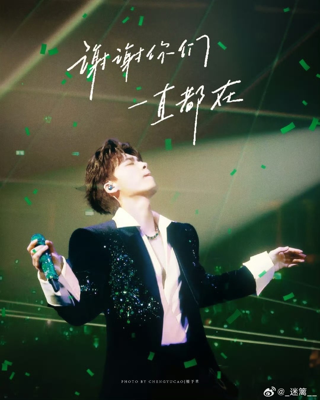 演唱期间,他特别重现了经典古装剧《古剑奇谭》中“百里屠苏”的造型,并深情演唱剧中插曲《剑伤》,一度哽咽落泪,双膝跪地,向粉丝表达感谢与悔意,感性喊话:“谢谢你们还在,我真的回来了!”