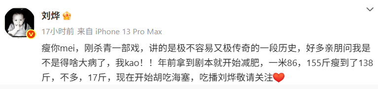 “好多亲朋问我是不是得啥大病了,年前拿到剧本就开始减肥,一米86,155斤瘦到了138斤,不多,17斤,现在开始胡吃海塞,吃播刘烨敬请关注。”