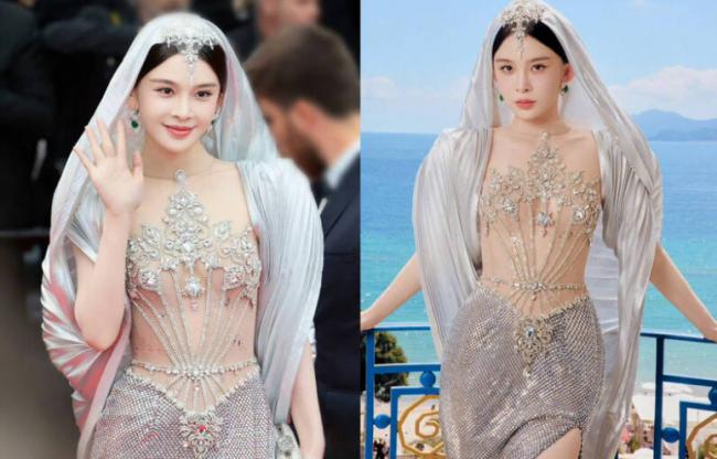 赵樱子身穿一袭银色透视礼服亮相,配搭绿宝石耳环与头纱,上半身以亮片图样覆盖,裙摆高开衩设计,加上整体为透肤材质,造型颇具争议。