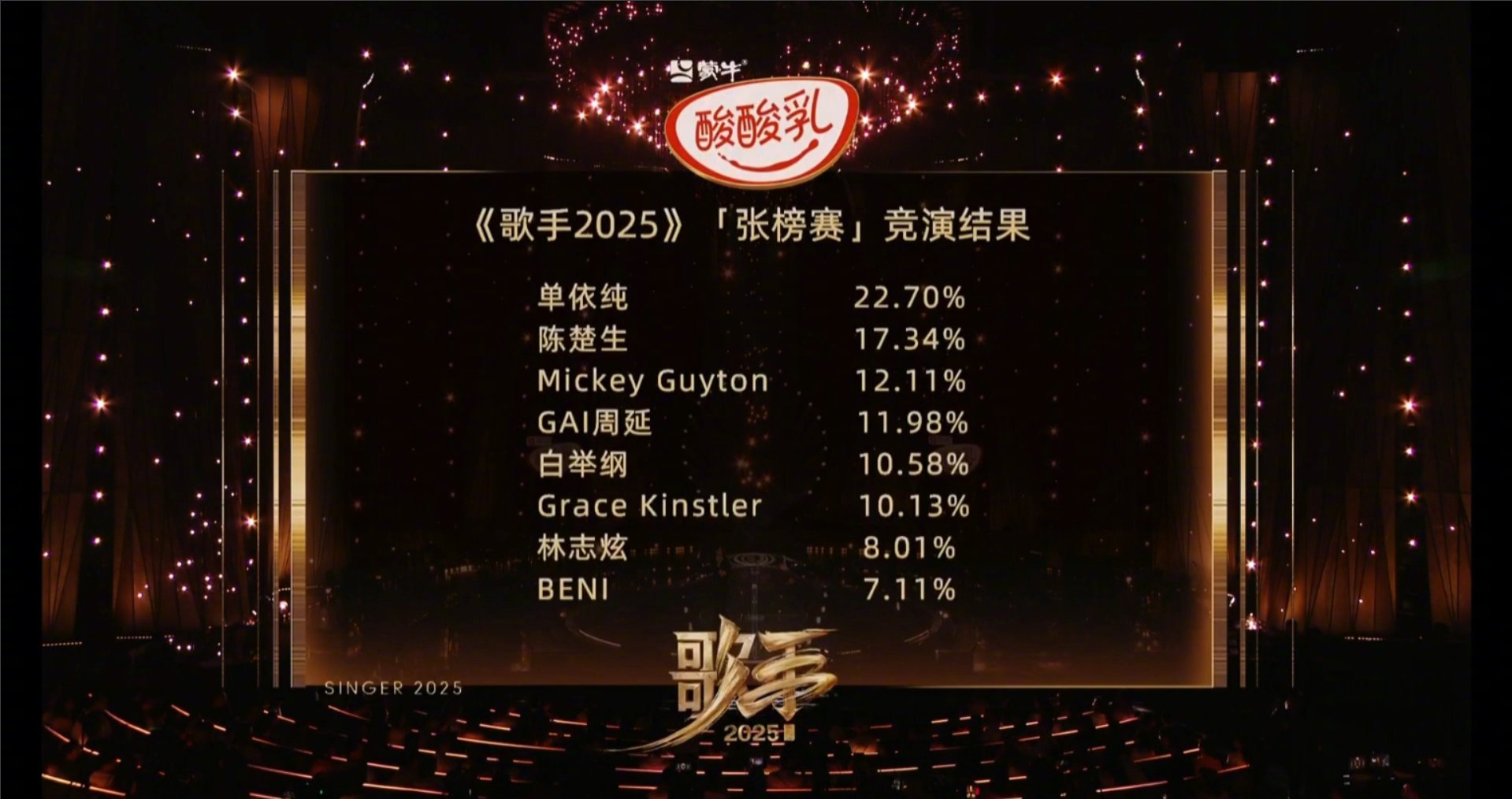 中国歌唱节目《歌手2025》昨晚正式开播,节目主打全程直播、不修音、全开麦的方式进行,第一集就上演淘汰赛,日本歌手BENI排名垫底出局,林志炫选唱《悟空》排名倒数第二险遭淘汰!