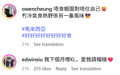 姚子羚也被大马美食吸引,留言要求打包,大马美食似乎征服了一众香港艺人的胃。