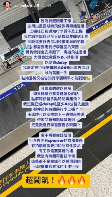 香港艺人高海宁日前与黄庭锋、周嘉洛前往英国利物浦拍摄,全程心情兴奋,返回香港后即投入工作,却因航空公司安排不当,行李延误,严重影响她的工作行程,让她愤怒不已,并在IG限时动态发文表达不满!