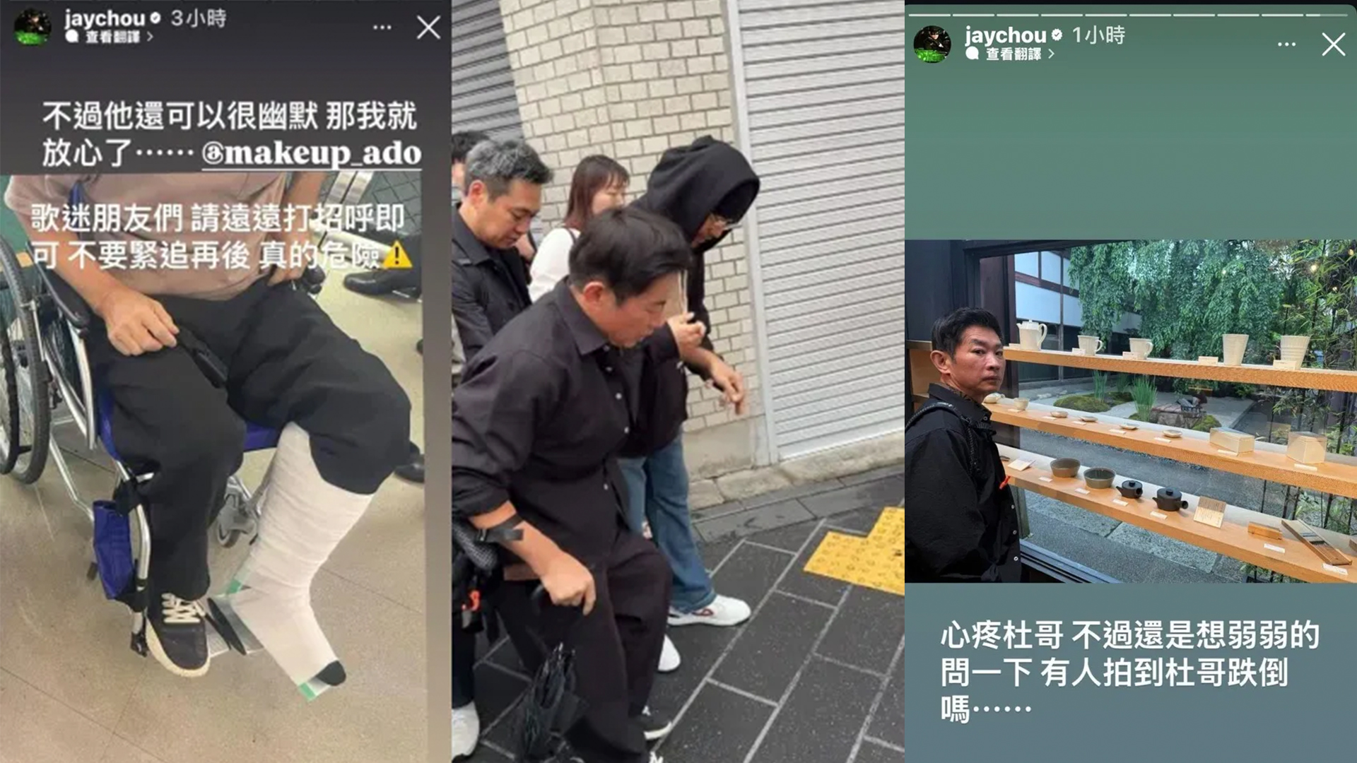 周杰伦随后在IG限时动态透露此事,并晒出杜哥坐轮椅、左脚打石膏的照片。