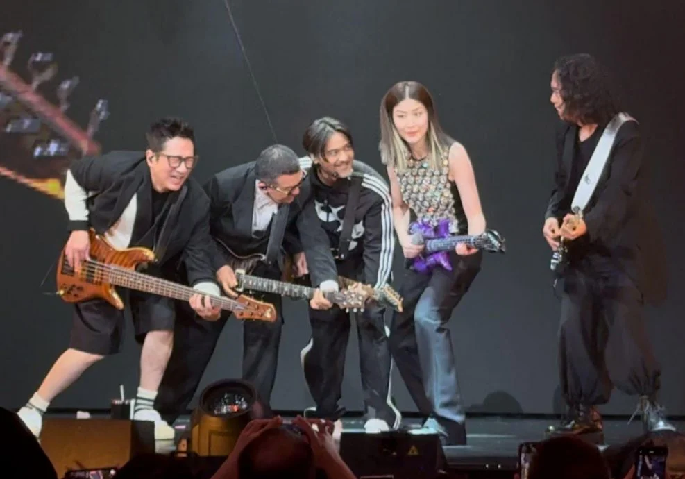 冯德伦当晚以黑色休闲造型登台,背着吉他与音乐总监雷颂德、单立文及邓建明合体伴奏,与Kelly合唱《纪念日》,瞬间点燃全场气氛。这也是继2023年澳门演唱会后,他再度为陈慧琳站台演出,粉丝惊喜不已。