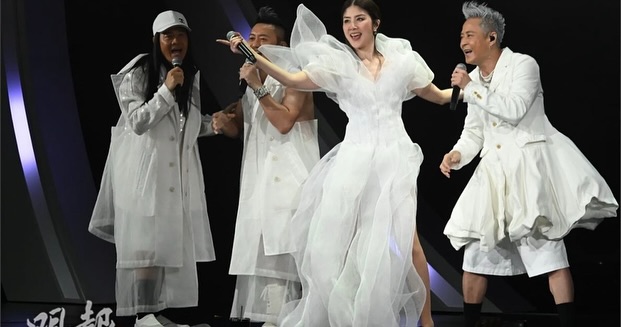 他们以白色造型登场,与陈慧琳合唱《热力节拍Wou Bom Ba》和《打开天空》,又唱又跳,全场嗨翻!陈慧琳更笑说:“台上有3个老公,好开心!”