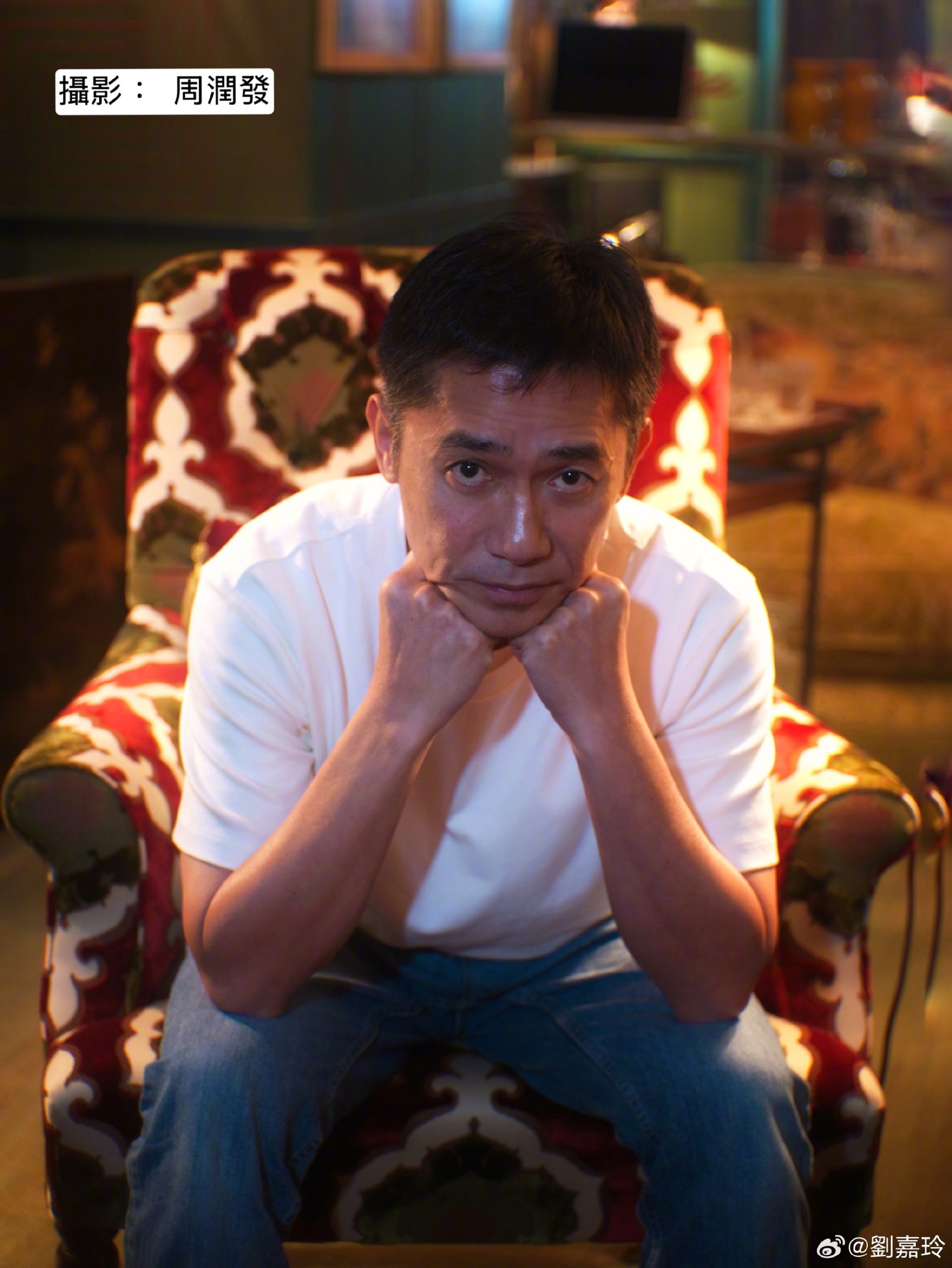 其中一张梁朝伟的单人照中,他坐在沙发上,双手握拳托著下巴,望向镜头,刘嘉玲在照片伤标注“摄影:周润发”,原来这张照片是由周润发掌镜拍摄。