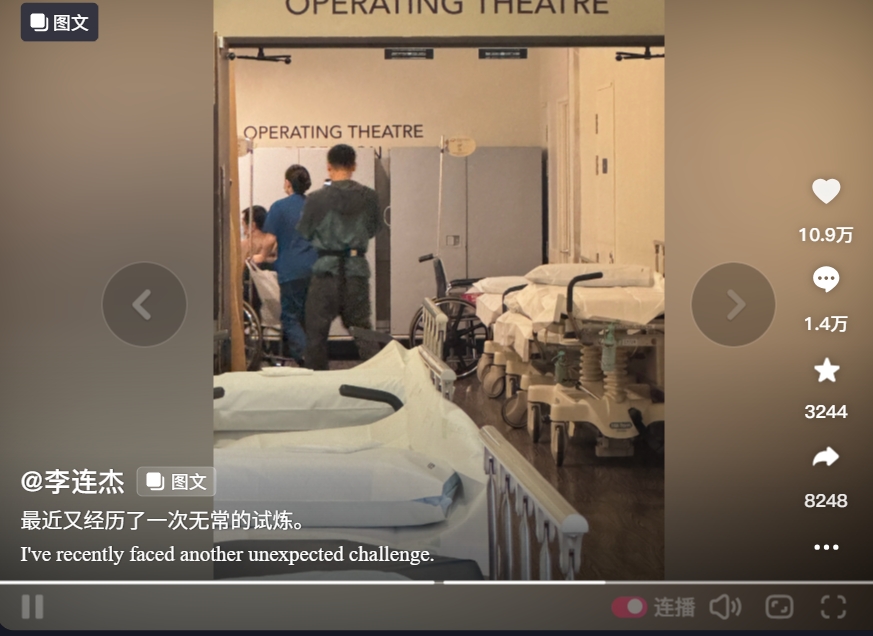 62岁武打巨星李连杰证实入院,通过抖音上载病床照自揭入院,并发文:“最近又经历了一次无常的试炼。”,引起了网络广泛关注。