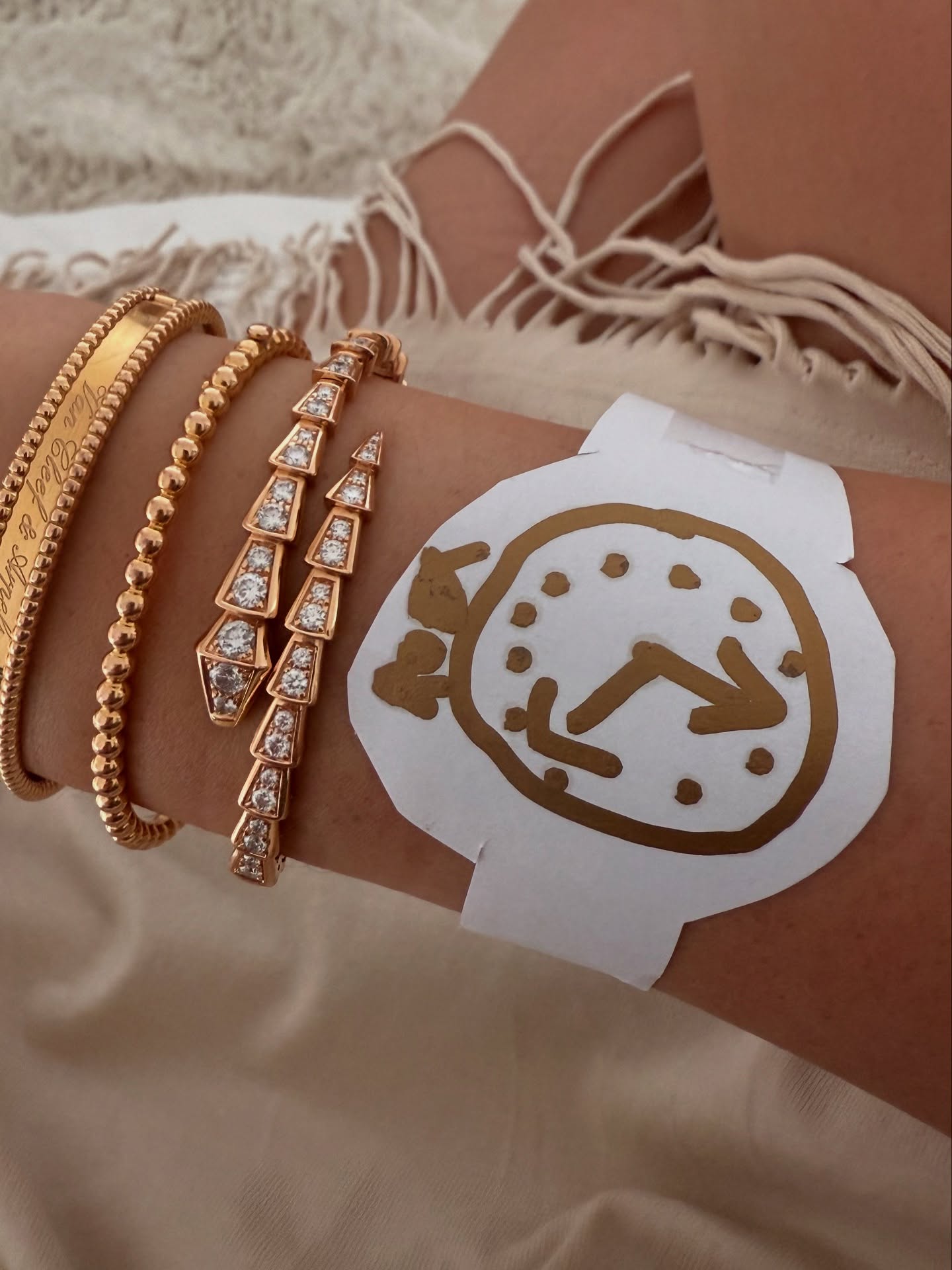 陈茵媺在IG分享女儿亲手绘制的‘金表’表示:「闪闪发光的金表,是我的小艺术家用爱手绘的!将它添加到我的黄金堆中,不确定我是否能准时赴约,但我仍然喜欢它! 她说这是我新买的‘金劳力士’”