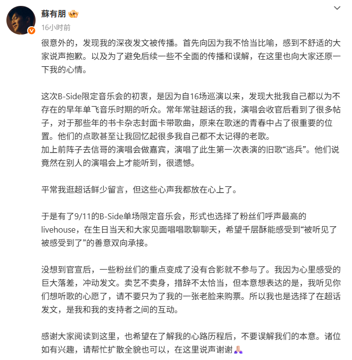 ”官宣后,一些粉丝们的重点变成了没有合影就不参与了。我因为心里感受的巨大落差,冲动发文。本意想表达的是,我听见你们想听歌的心愿了,请不要只为了我的一张老脸来购票。”