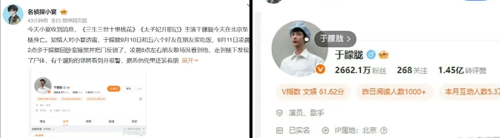 微博今日(11日)流传消息称,曾出演《三生三世十里桃花》、《太子妃升职记》、《永夜星河》等剧的中国男演员于朦胧在北京坠楼身亡;不少粉丝留言要求工作室尽快回应,“于朦胧快出来辟谣”更一度登上微博热搜。
