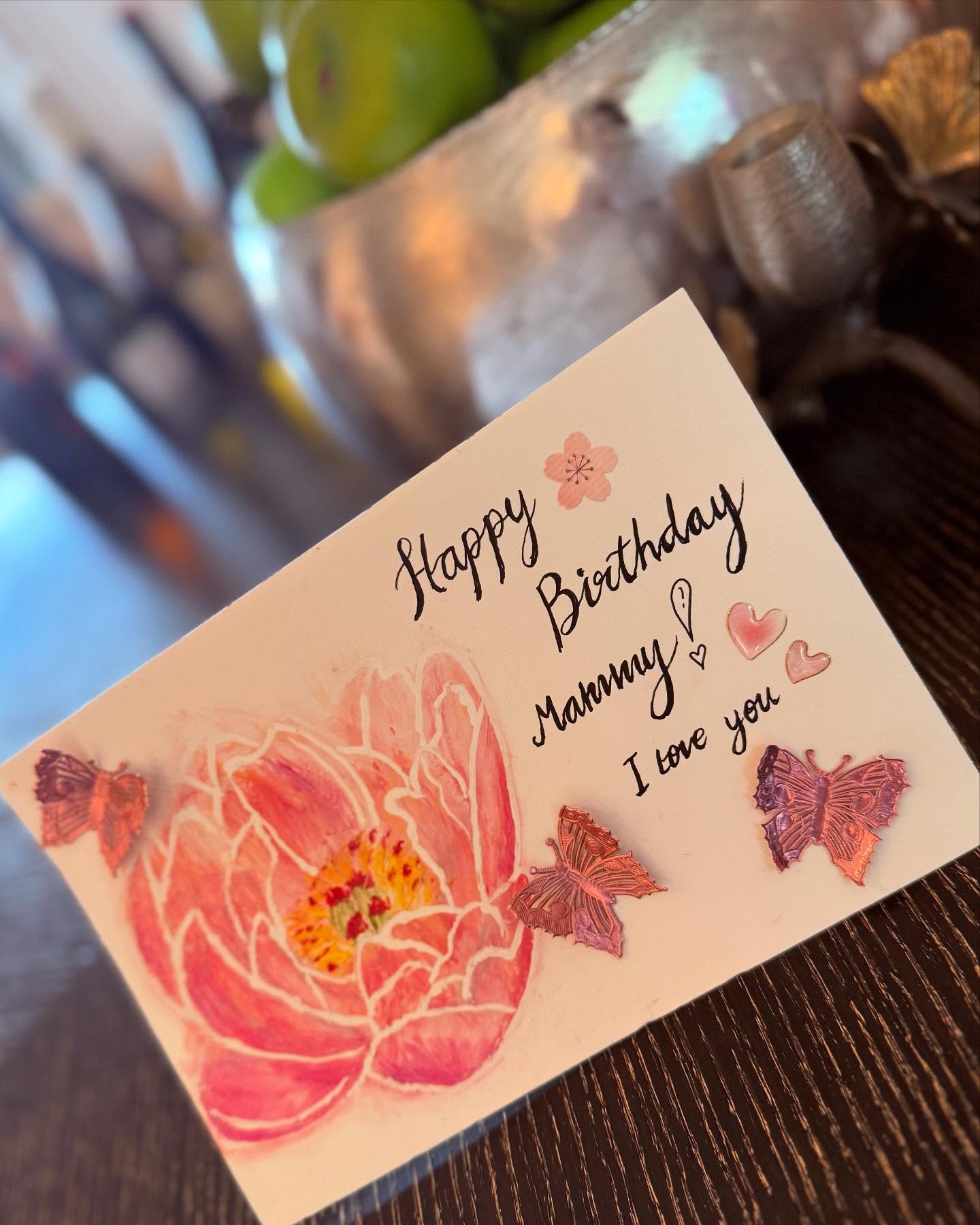 另一张手绘花朵的卡片上则写著“Happy Birthday Mammy! I love you”,童心与爱意满满。除了女儿们的礼物,黎姿也收到了丈夫马廷强的鲜花。