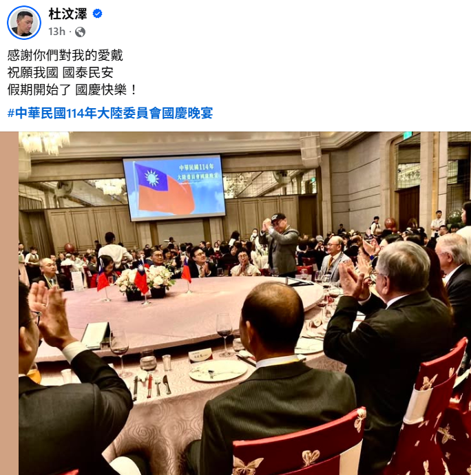 杜汶泽9日参与中华民国114年大陆委员会国庆晚宴,他晒出一张出现场照,发文写道:“感谢你们对我的爱戴,祝愿我国国泰民安,假期开始了,国庆快乐!”