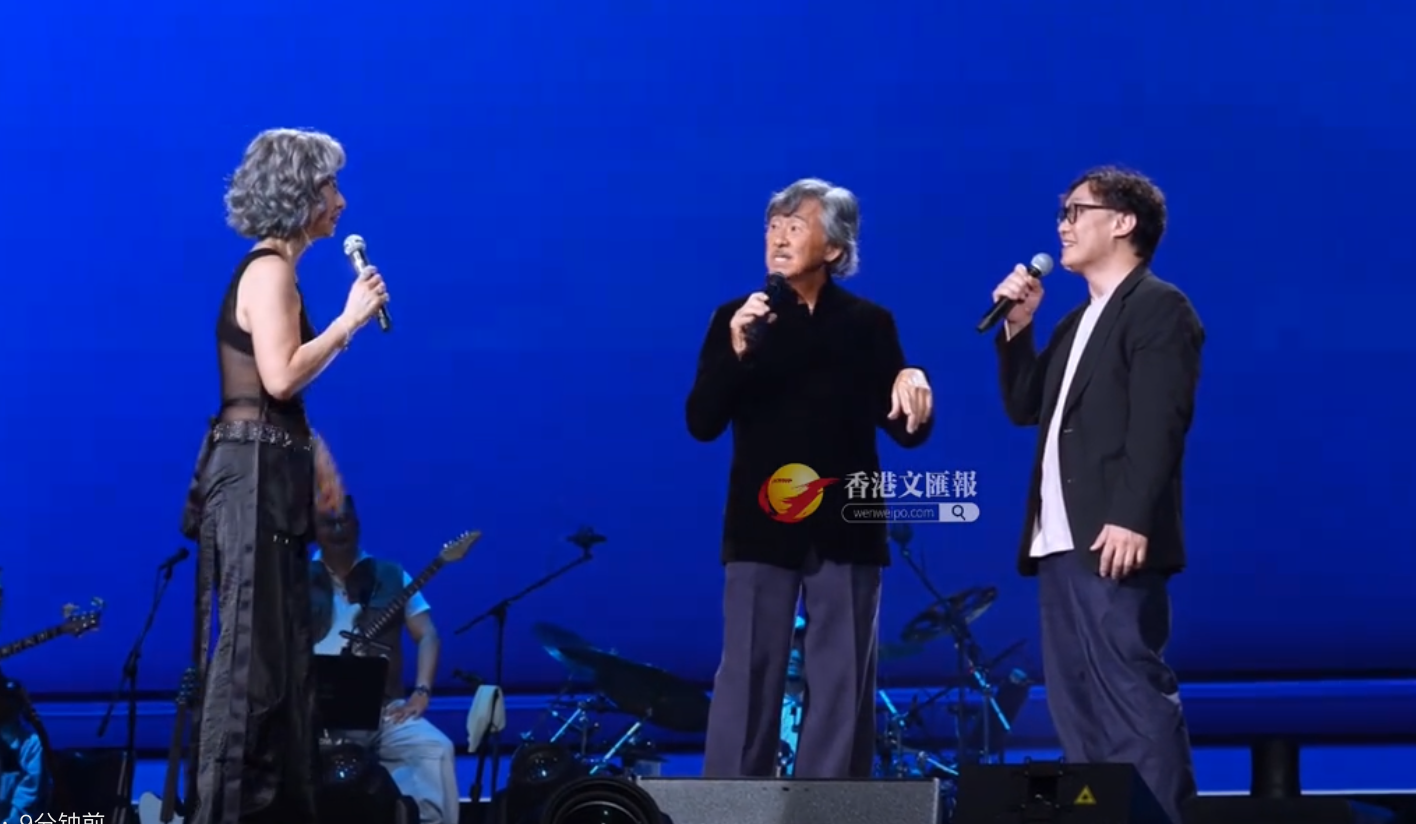林子祥现场一气呵成唱出歌曲中段的数字饶舌,叶蒨文则一边跳舞一边合唱;歌曲结束后,陈奕迅更单膝下跪,笑称“甘拜下风”,并打趣问:“你们是怎么做到的?”全场观众笑声不断,气氛热烈。