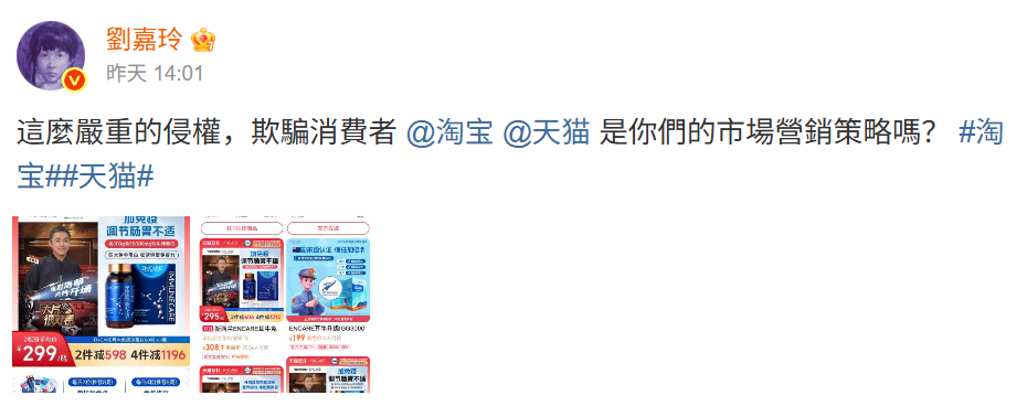香港女星刘嘉玲10日突在微博“开骂”,点名多家网购平台“欺骗消费者”,怒批商家严重侵权,引发网络热议;原来她发现有品牌擅自使用丈夫梁朝伟的照片,为保健品打广告,令她相当气愤。
