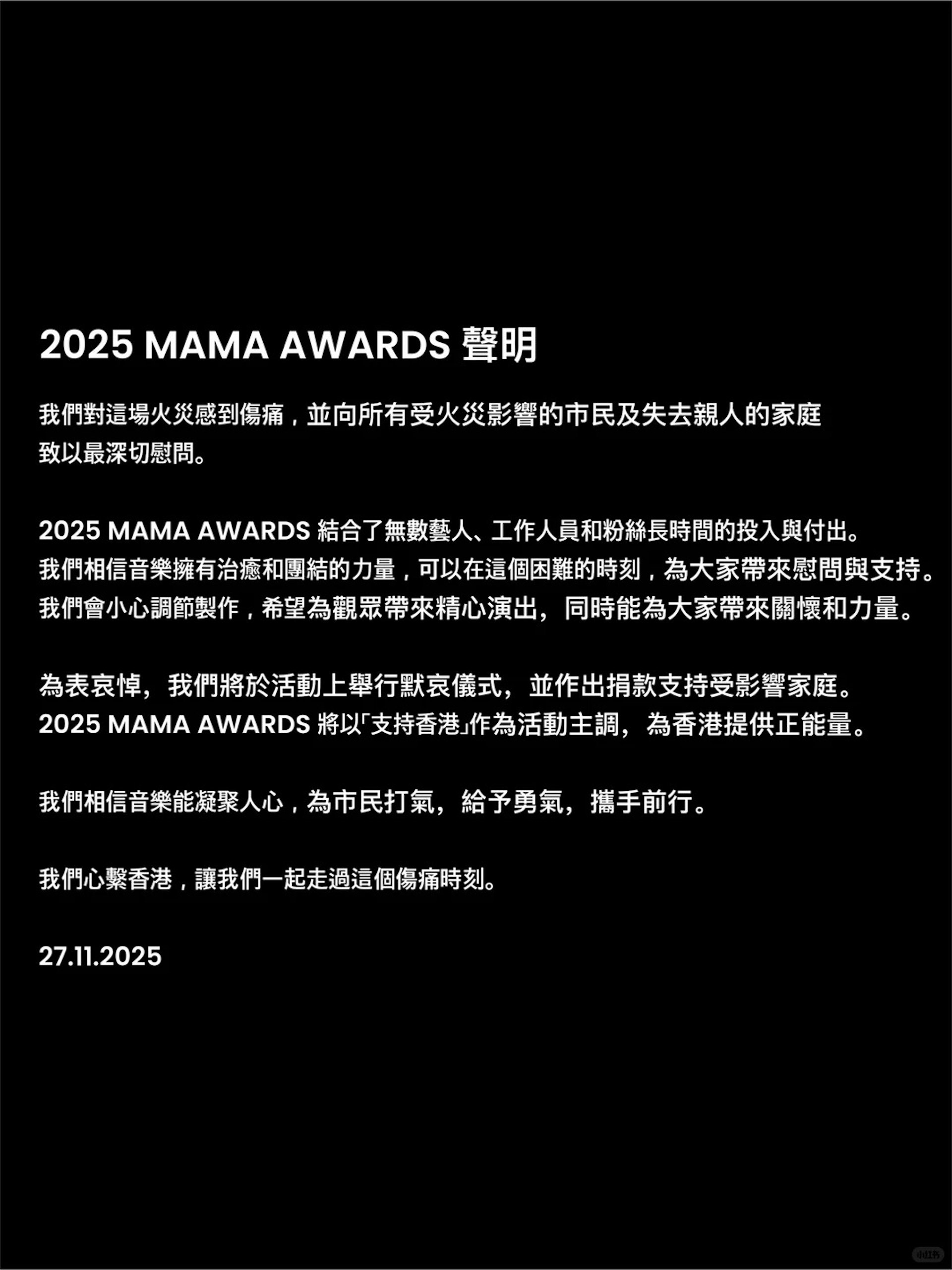 香港大埔宏福苑发生5级大火,香港娱乐圈多项活动宣布取消获展延,今明两晚(28日及29日)于启德主场馆举行的MAMA颁奖礼如期举行,惟主办单位宣布取消红毯环节,香港人气男团MIRROR宣布不参与颁奖礼及演出。