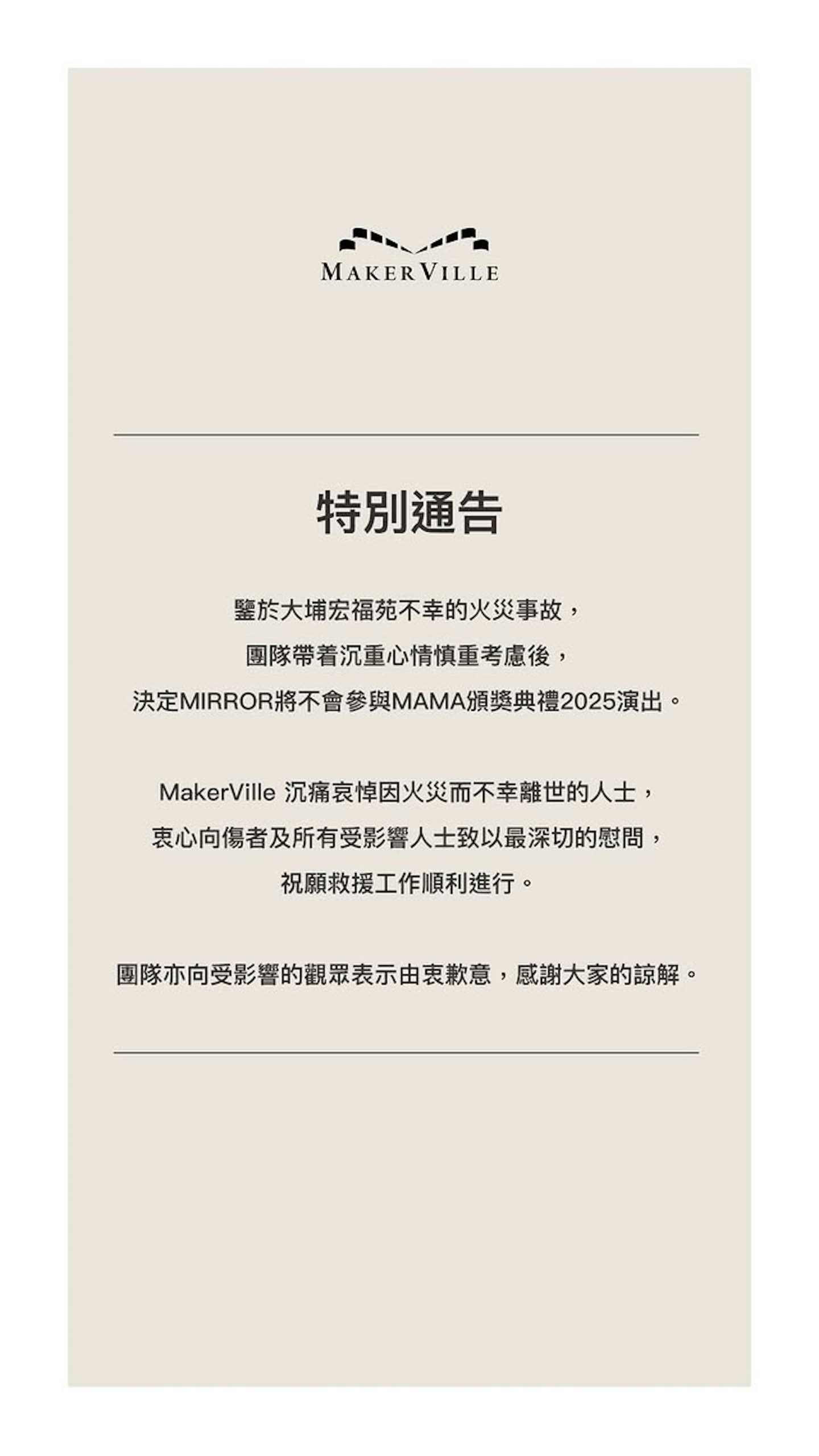 原本将亮相MAMA颁奖礼的MIRROR将缺席颁奖礼:“考虑到宏福苑火警带来的不幸和悲剧,经内部慎重讨论后,决定将不会参与今次MAMA颁奖典礼的演出活动,以示对受灾家庭和死伤者的尊重与哀悼。