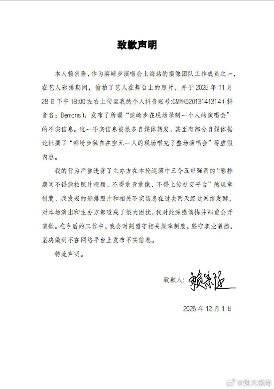 报道指,这场争议源自负责上海场摄影工作的工作人员赖宗隆。他在微博以“烟火濒海”发文道歉,承认违反规定在彩排期间私自拍摄舞台画面,并于11月28日上传至抖音,以不实标题称“滨崎步在录制一场没有观众的演唱会”。