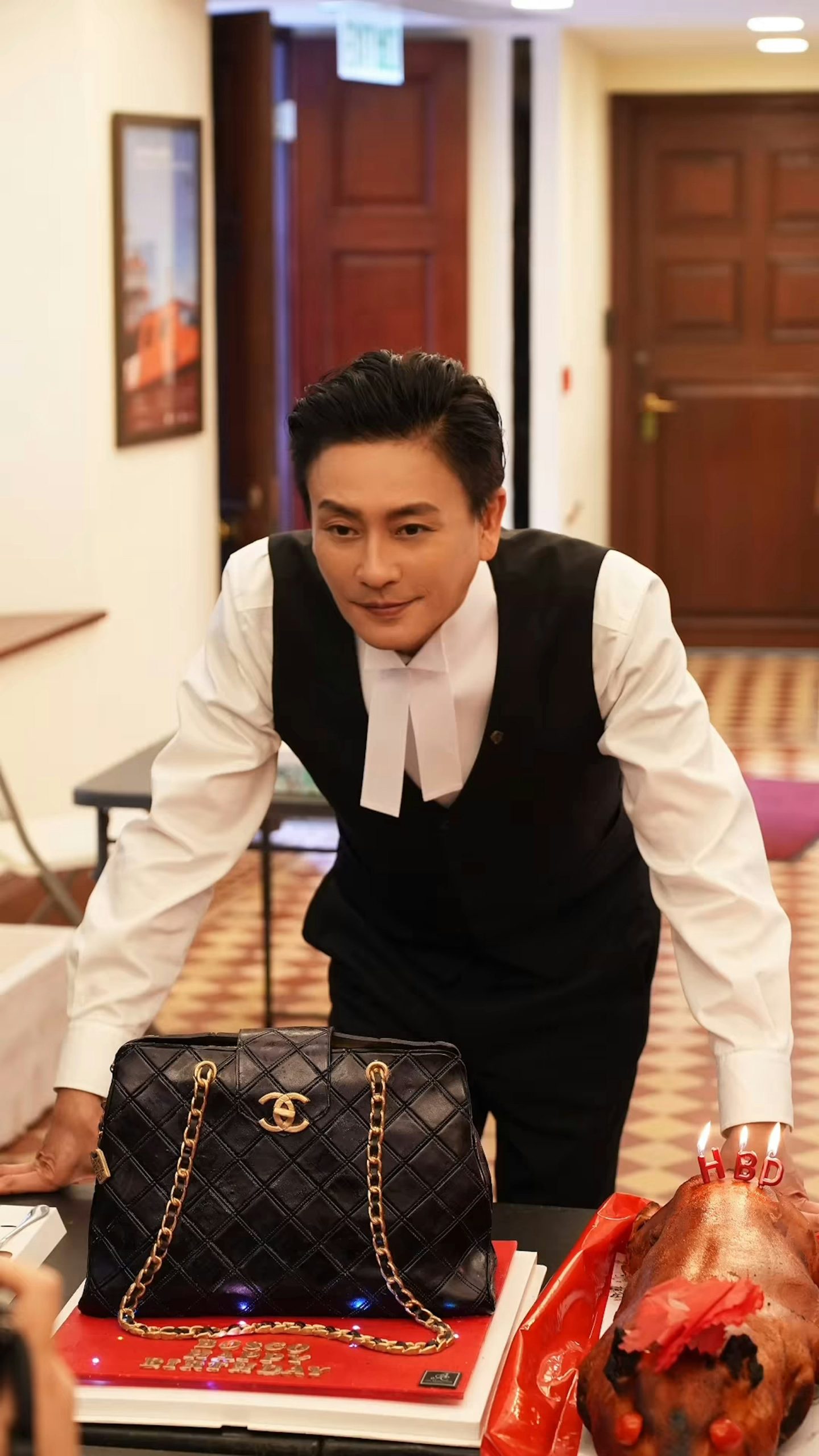 剧组以他在《新闻女王2》中爆红的名牌包为灵感,订制“一比一复刻”名牌包造型蛋糕,并配烧猪助兴。