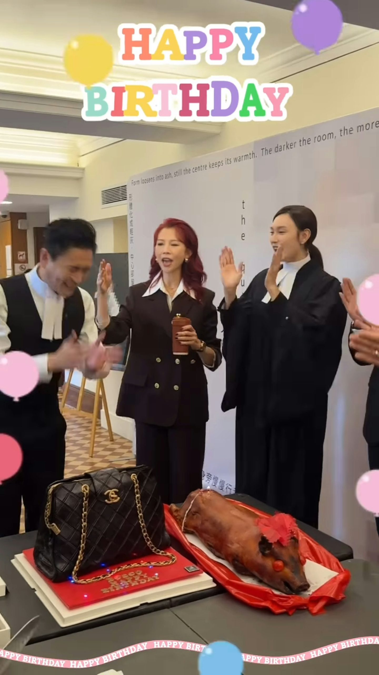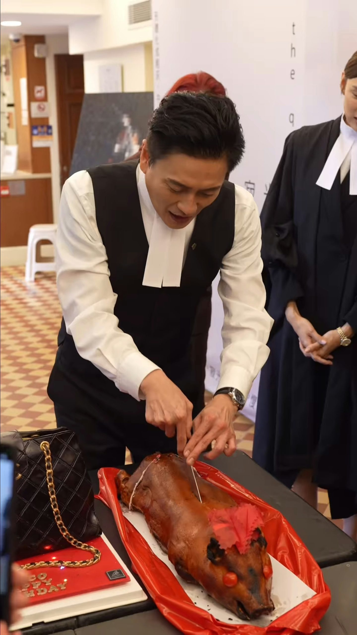 剧组以他在《新闻女王2》中爆红的名牌包为灵感,订制“一比一复刻”名牌包造型蛋糕,并配烧猪助兴。