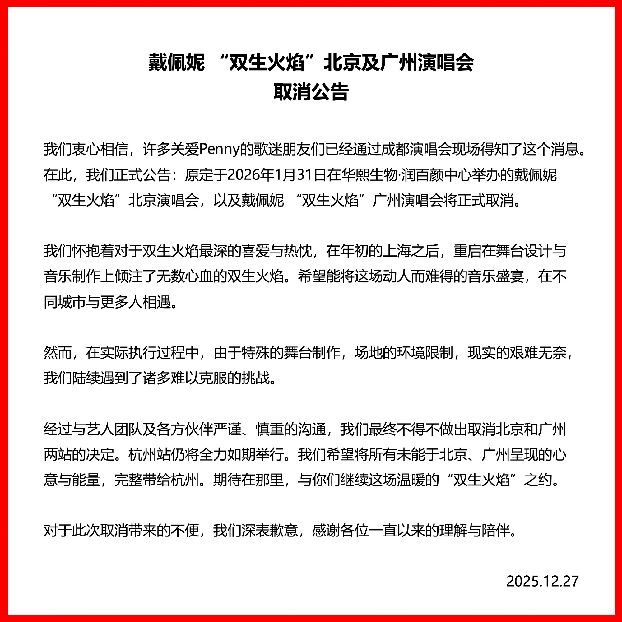 随后主办单位Live Nation公告称,因特殊舞台制作、场地限制及多重挑战,经过慎重评估后取消北京、广州两站。