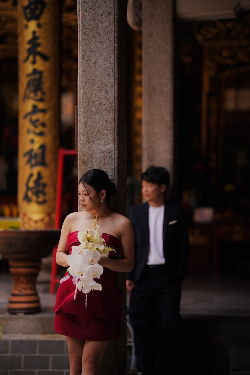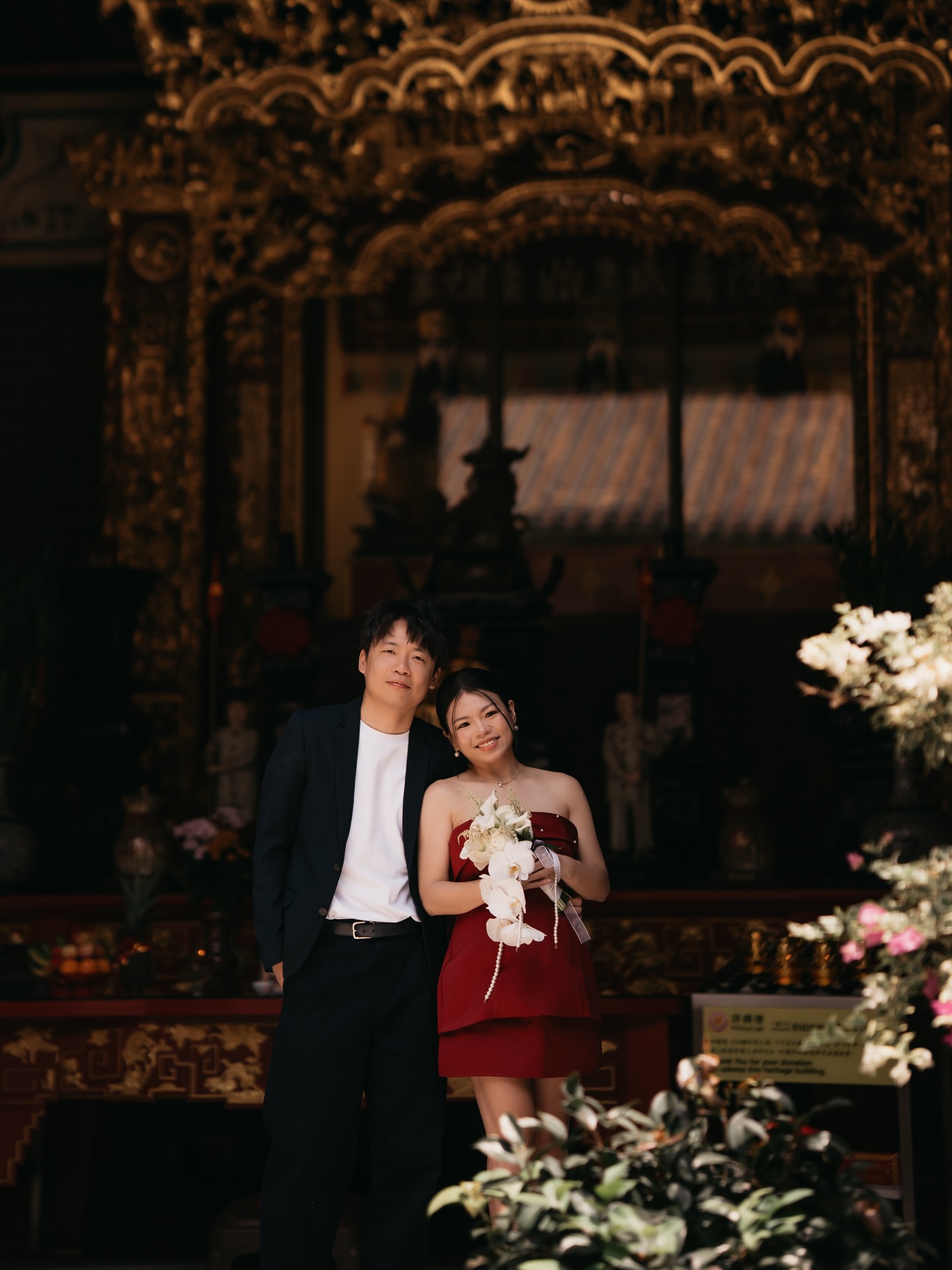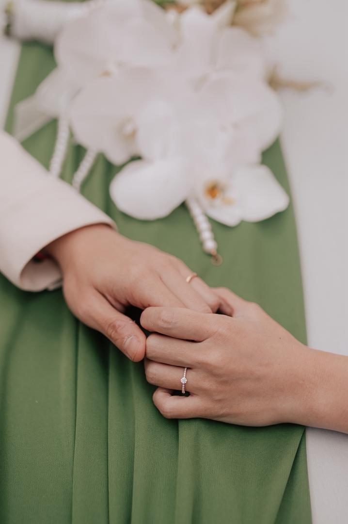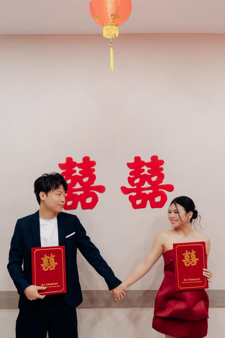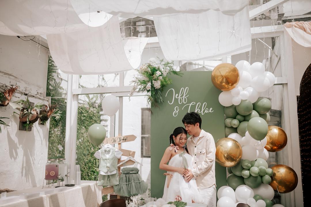 当天注册仪式不仅有结婚登记,也顺势进行 宝宝性别揭晓。Chloe精心设计了小环节:宾客抽取红包,其中一封任务卡里写着让抽中者拿男宝宝和女宝宝的衣服,由她亲自揭晓。