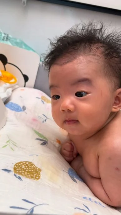 这对父母近日在宝宝的社交账号上上传了一支新视频,曝光小儿子的圆润身形,袁伟豪幽默写道:“宝宝特别认真,上身这么有力量,做半平板支撑整整十分钟,妈妈都累坏了 #袁氹氹 两个月”。