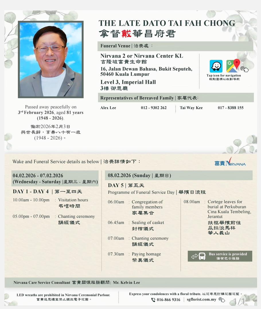 据家属发出的讣告,戴华昌将于2月4日至7日在吉隆坡富贵生命馆设灵,并于8日举殡,灵柩运返瓜拉淡马林华人义山安葬。