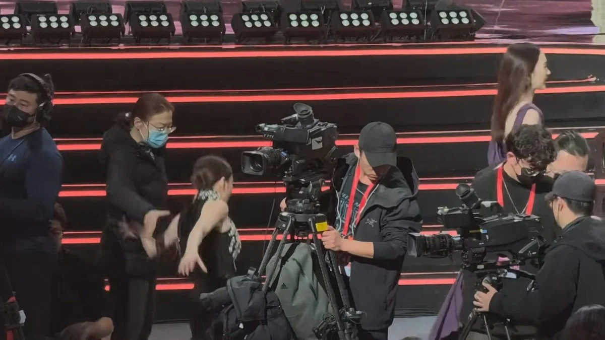视频中可见,穿着优雅长裙、高跟鞋上阵的她正走向舞台,途中疑似为避开地面电线,脚步一乱失去重心向前跌去。身旁工作人员反应神速冲上前扶人,她很快站稳,整理仪态后继续上台领奖,全程淡定到不行,专业度满分。