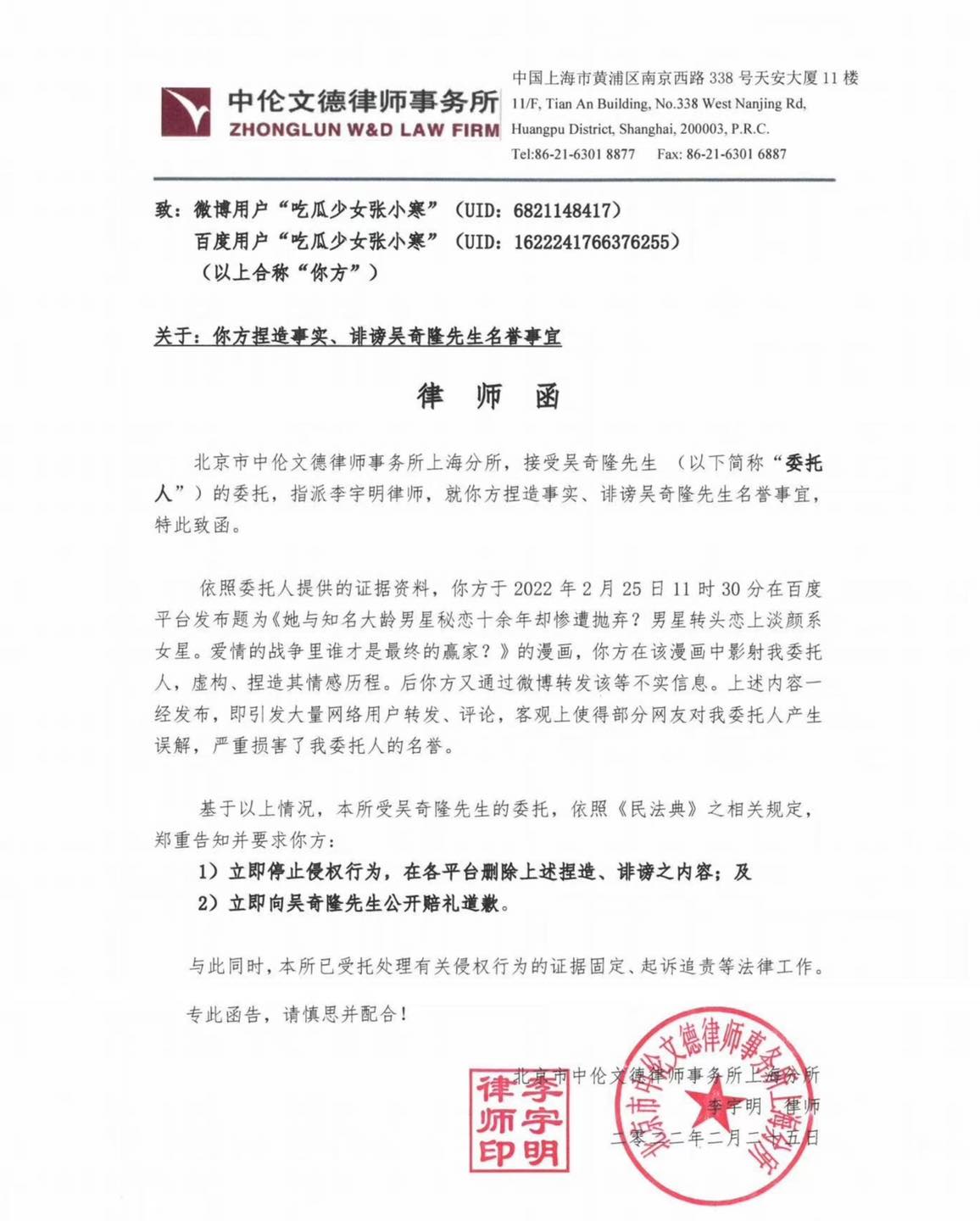 吴奇隆委托律师发出声明,指控“吃瓜少女张小寒”捏造事实、诽谤名誉:“你方在该漫画中影射我委托人,虚构、捏造其情感历程。后你方又通过微博转发该等不实信息。上述内容一经发布,即引发大量网络用户转发、评论,客观上使得部分网友对我委托人产生误解,严重损害了我委托人的名誉。”