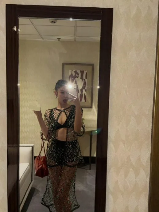 随后,Jennie在限时动态中晒出一张自拍照,只见她全身黑色造型前卫又性感,以内搭比基尼式上衣与高腰短裤,外披透视网纱长洋装,亮片与几何网格在灯光下闪闪发亮,若隐若现地展现出纤细腰线与腹部曲线。手提一只红色精品包,发型俐落向后梳起,整体造型既有态度又不失性感,而她对镜头竖起中指的动作,更让整张照片充满强烈态度。
