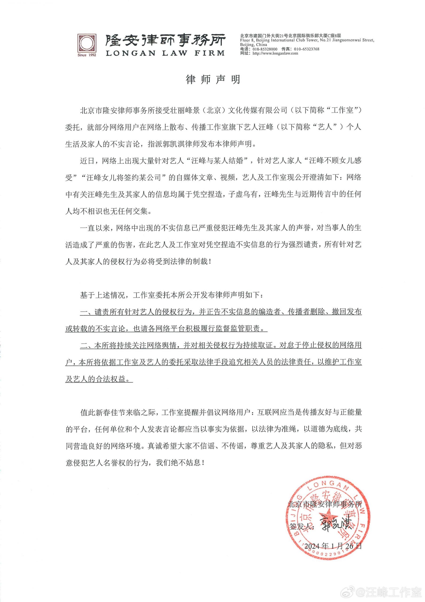 “传言已经严重侵犯汪峰和家人声誉,也造成严重伤害,因此工作室也决定采取法律手段。”