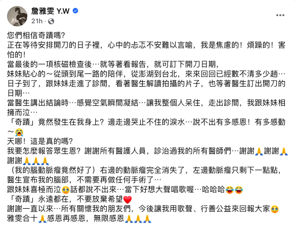 詹雅雯发文透露,原本在等待安排开刀的日期,心情十分焦虑、烦躁且害怕,怎料检查报告出炉后,医生告知她脑部右边的动脉瘤已完全消失,左边的动脉瘤只剩下一点点,不需要再做任何手术。当下詹雅雯开心到说不出话,和妹妹相拥而泣。