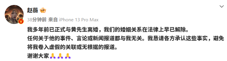 赵薇今日忽然在微博发文自曝已经离婚:“我多年前已正式与黄先生离婚,我们的婚姻关系在法律上早已解除。”