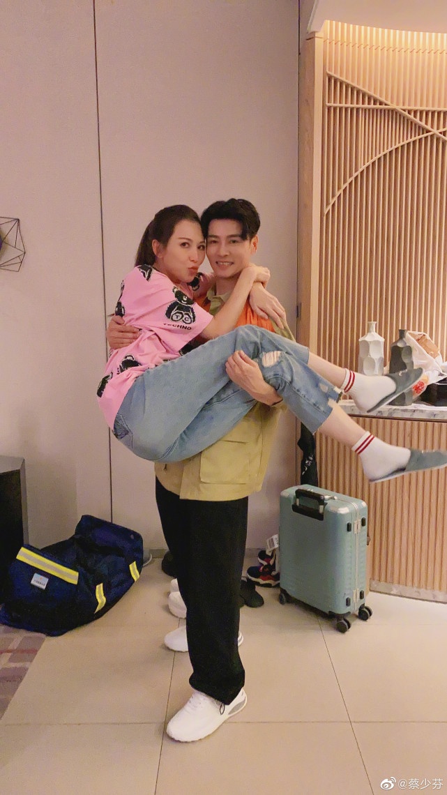 照片中,蔡少芬和张晋对着镜头深情亲吻着,张晋还一把将蔡少芬公主抱,看起来丝毫不感觉费力的样子,而在老公怀中的蔡少芬张开双臂摆着甫士,还嘟嘟嘴卖萌。