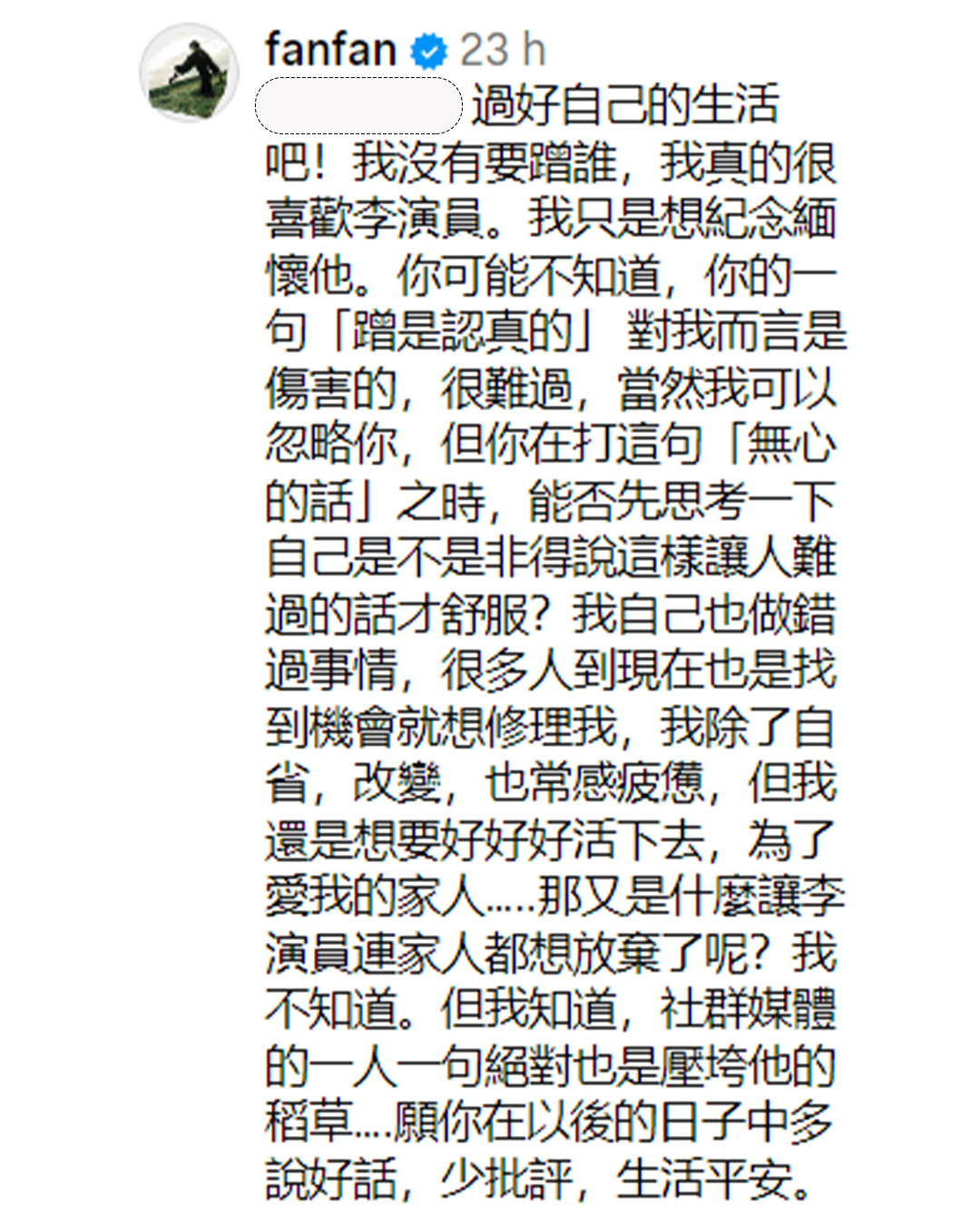 然而却又网民留言嘲讽“蹭热度你是认真的”,为此范玮琪回复反击:“过好自己的生活吧!我没有要蹭谁,我真的很喜欢李演员。我只是想纪念缅怀他。”