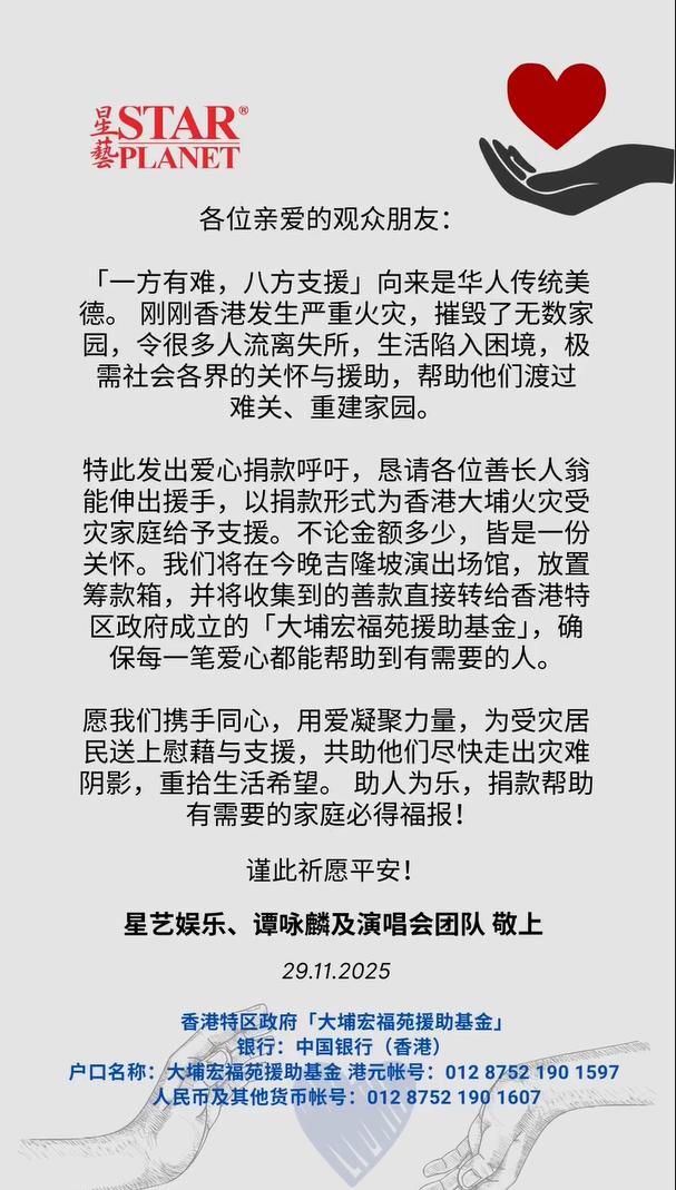 星艺娱乐今天在社媒发文告指出,今晚吉隆坡演出场馆,将放置筹款箱,并将收到的善款直接转给香港特区政府成立的“大埔宏福苑援助基金”,确保每一笔爱心都能帮助到有需要的人。