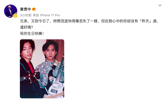 黄贯中也晒出合照:“兄弟,又到今日了,时间流逝快得像丢失了一样,但在我心中的你却没有‘昨天’过,还好吗?祝你生日快乐!”