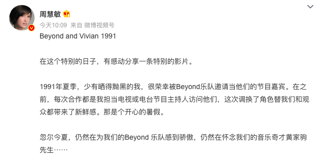 此外,周慧敏在微博发了1991年上Beyond节目当嘉宾的影片,她感性写道:“在这个特别的日子,感动分享一条特别的影片。”