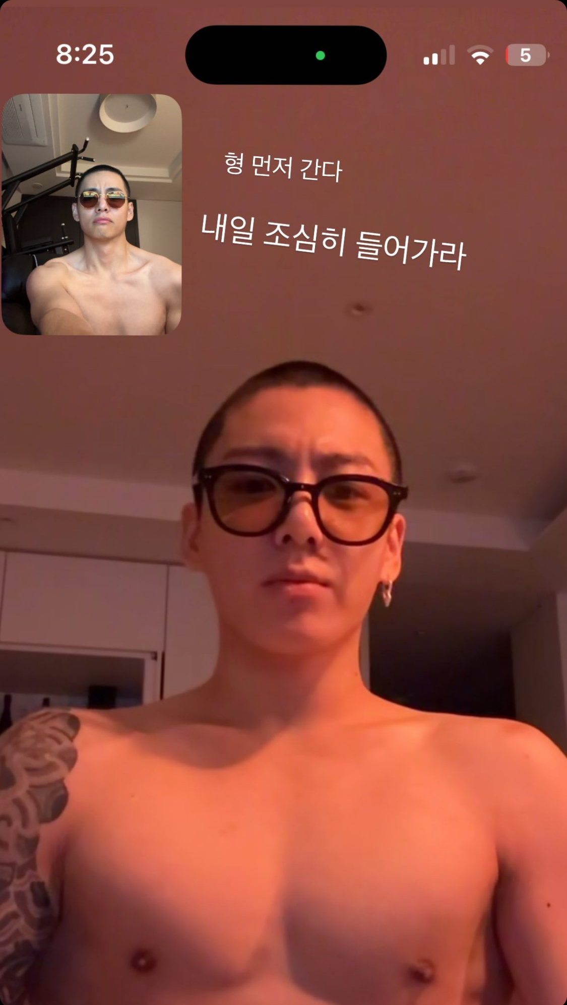 V预定今日入伍报到,他提前释出了一张光头戴墨镜照片,除了宣告“倒数一天”,还向歌迷表示“去去就回”;V的限时动态中,还发出一张和“忙内”柾国视讯通话的画面,这也让柾国的平头造型跟着曝光。